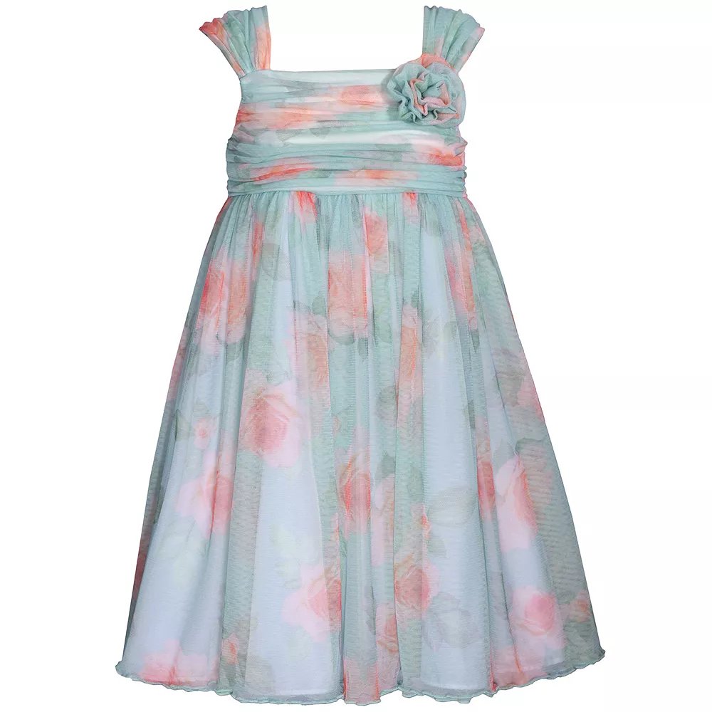 Floral charm abounds on this girls’ babydoll dress from Bonnie Jean.